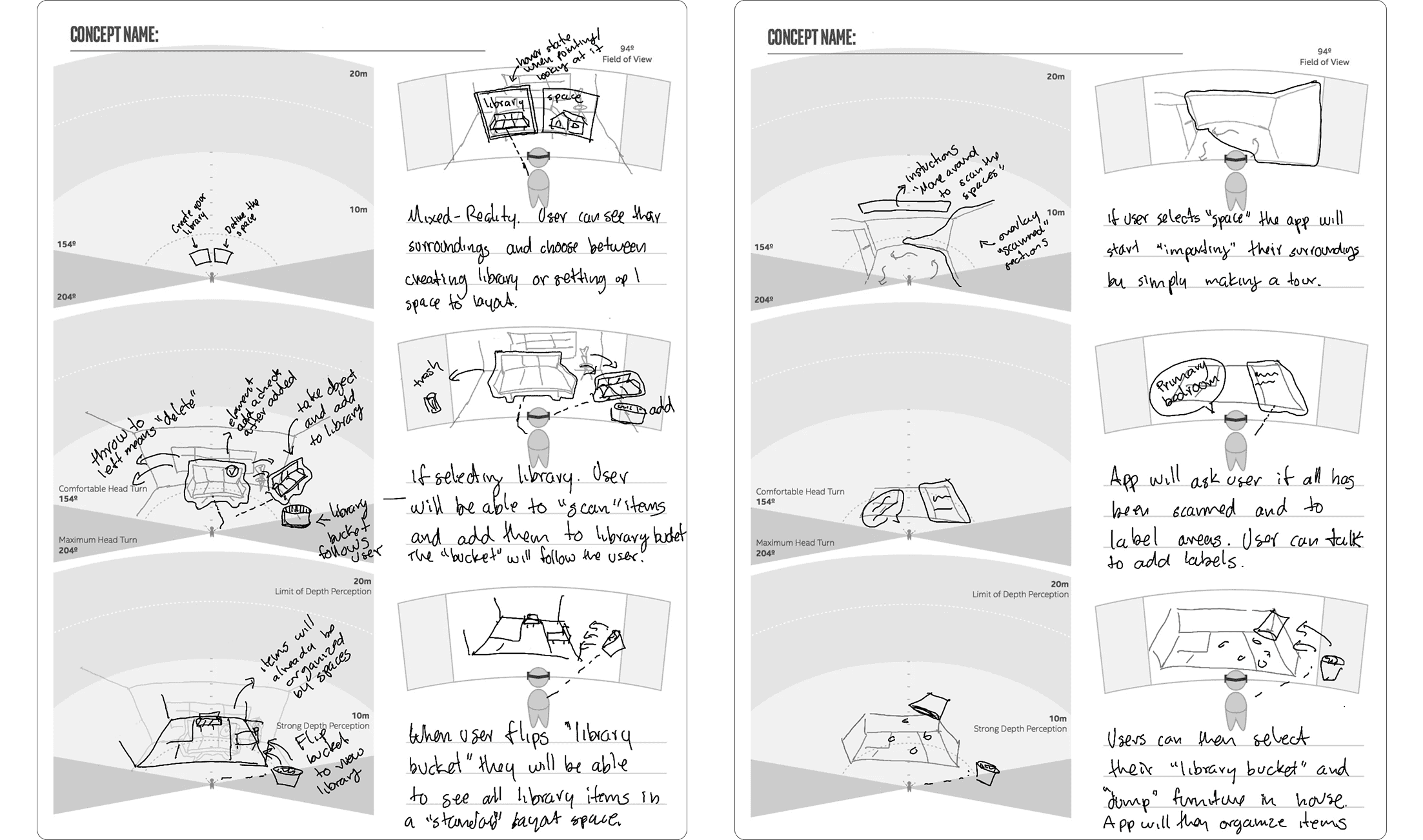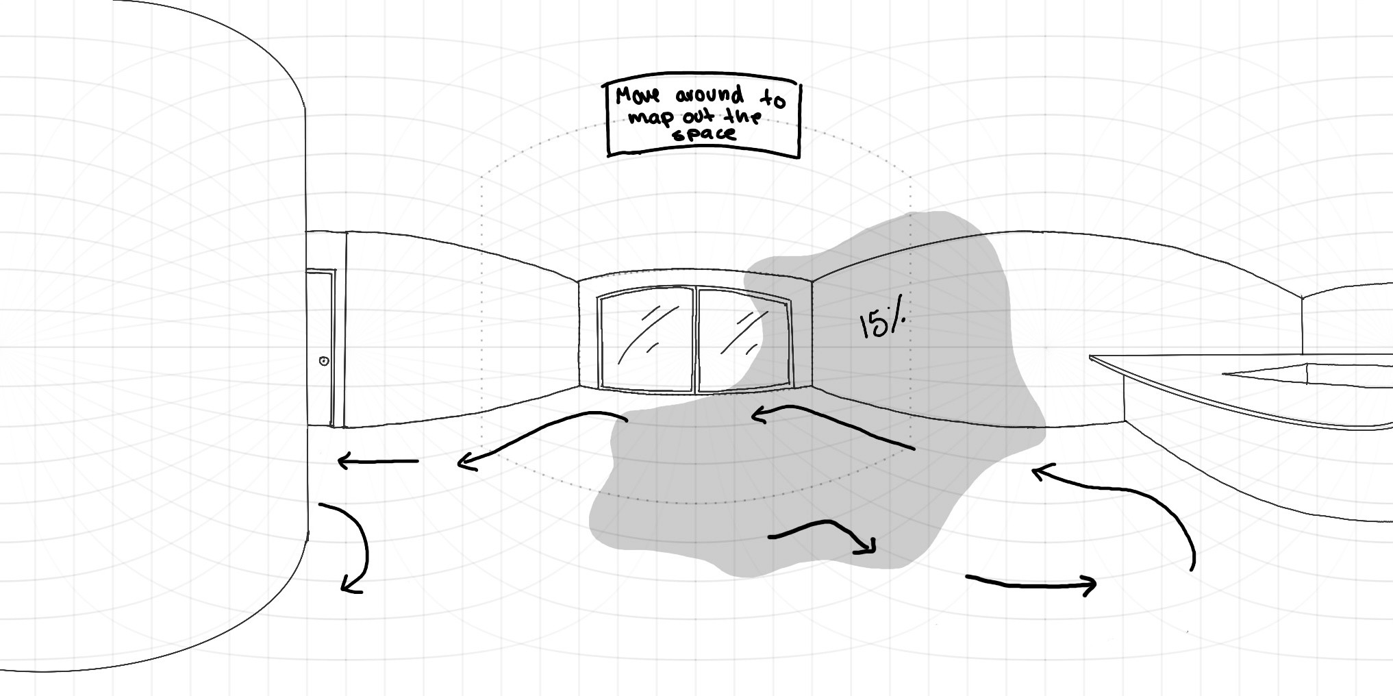 To bridge this gap, I began with 2D hand sketching and photosphere perspective drawings to explore spatial interactions and user flows. This groundwork informed rapid prototyping in ShapesXR, allowing for quick iteration and validation before transitioning into Unity for full development. User feedback refined UI design, haptic responses, and spatial interactions, ensuring a natural and intuitive experience.